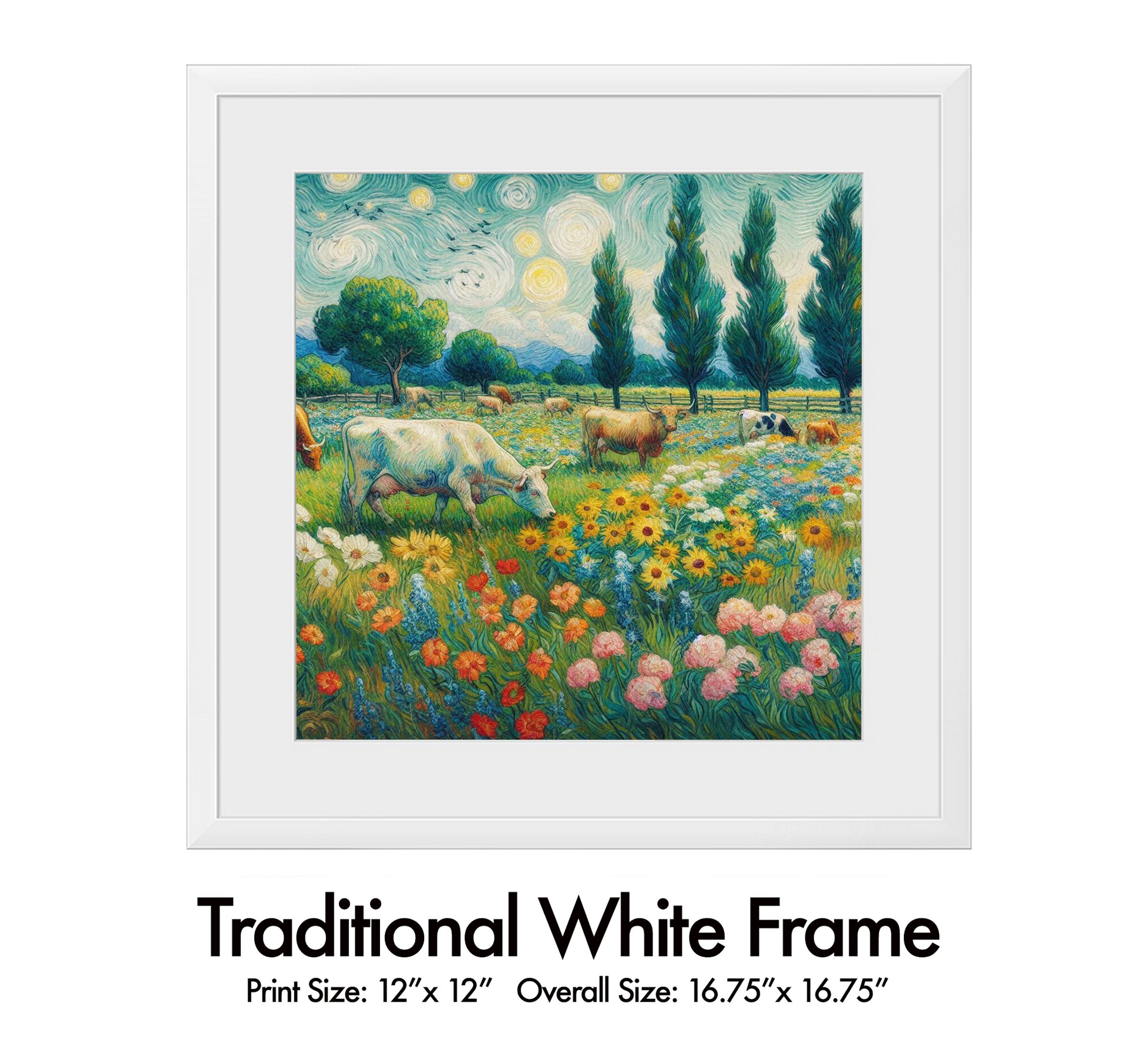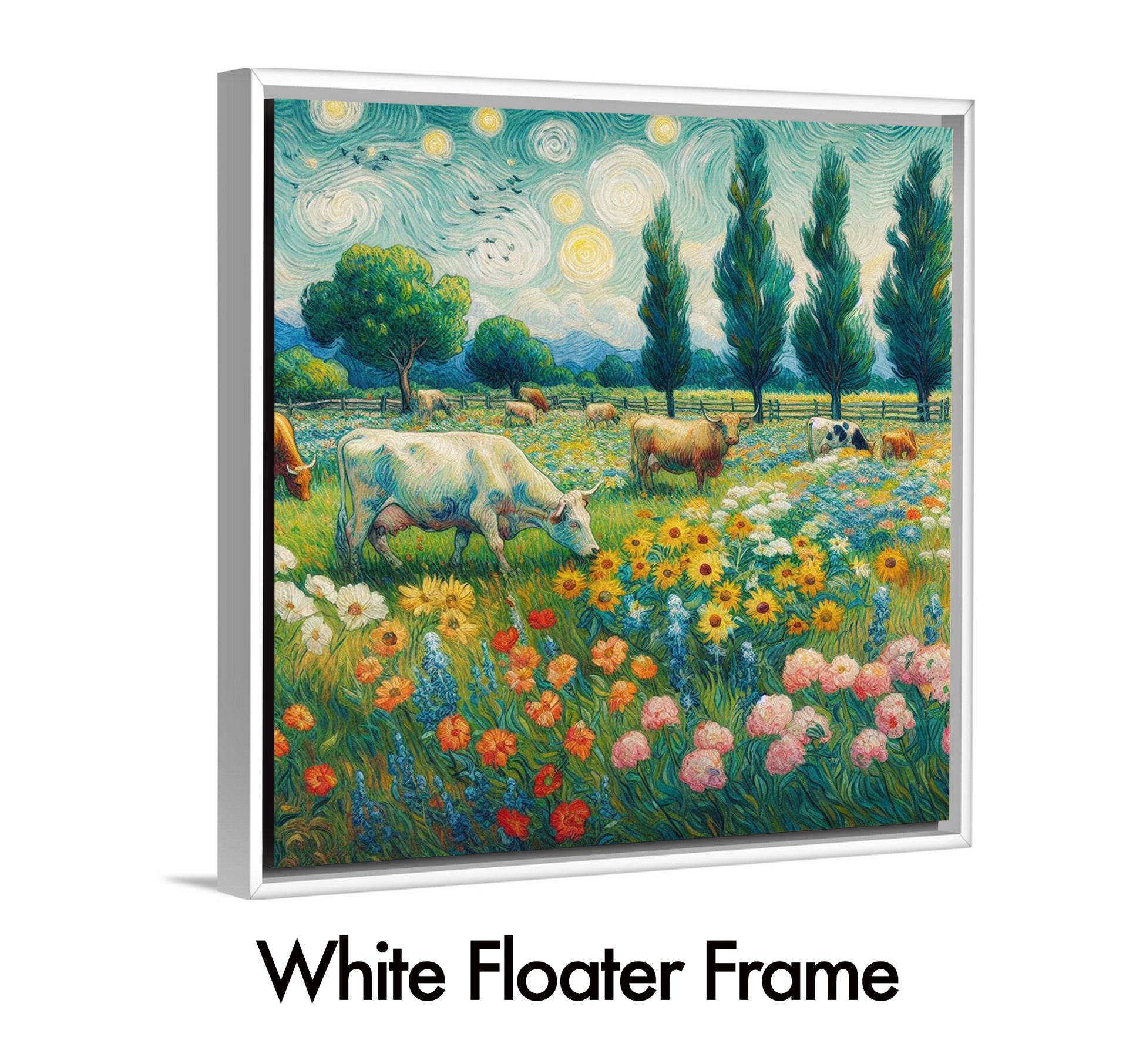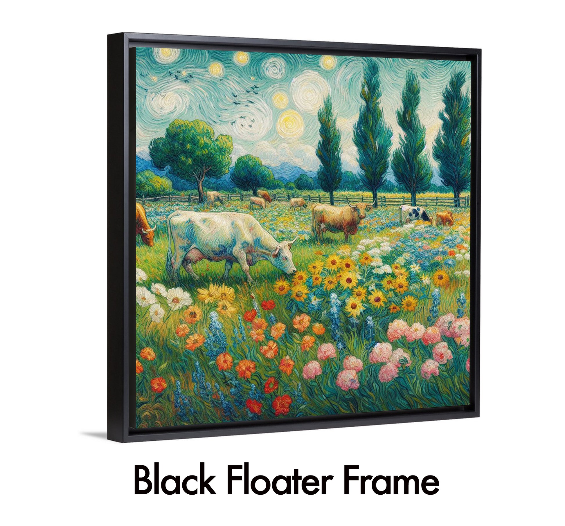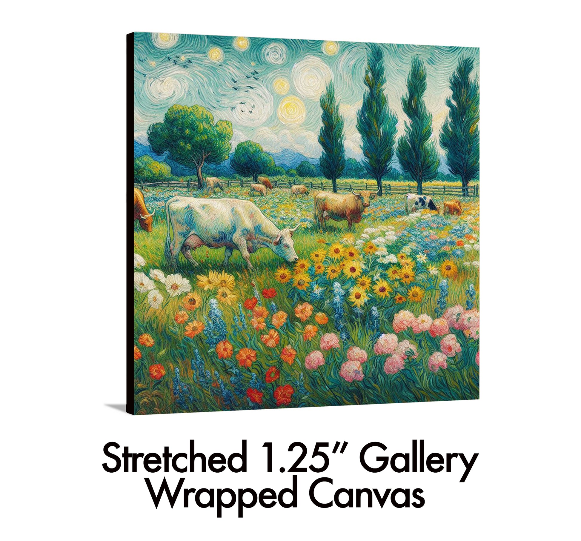 Beautiful Van Gogh style landscape with grazing bovine and lots of flowers. Colorful, calming and well designed.